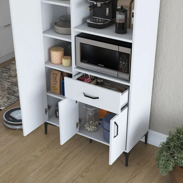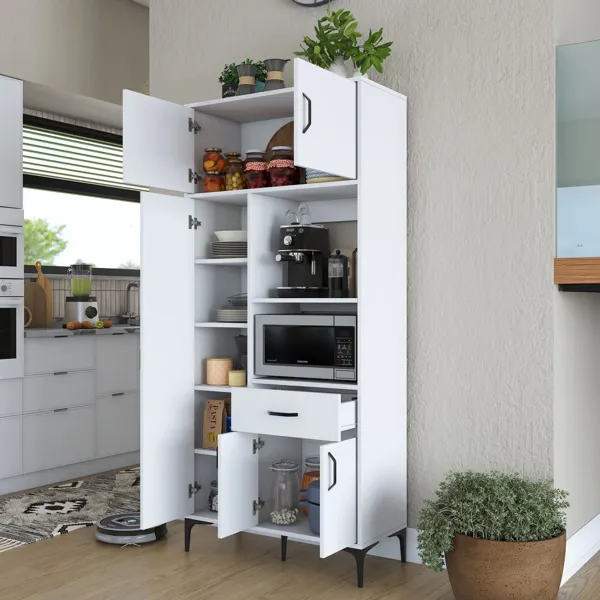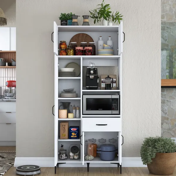 Babylon ormar sa 5 vrata i 1 ladicom nudi praktična rješenja za odlaganje viška stvari u zajedničkim prostorijama vašeg doma. Višenamjenski ormar, koji posjeduje poseban prostor za mikrovalnu pećnicu, omogućava vam da uredno odložite sezonski pripremljene tegle, kao i namirnice dugog roka trajanja poput mahunarki.